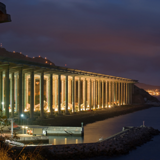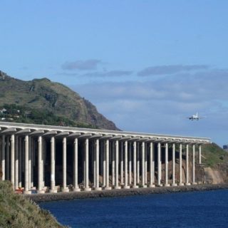 Letiště Funchal, dobrá polovina stojí nad Atlantickým oceánem a sloupy jsou večer barevně osvětlené což navozuje…