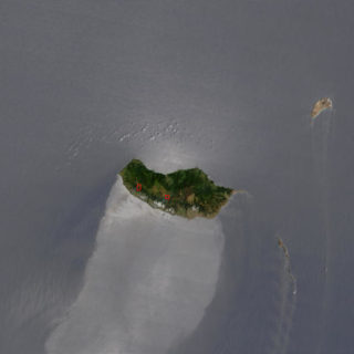 Madeira z ISS, vpravo nahoře malý ostrůvek Porto Santo a vpravo dole neobydlené útesy Desertas Ilhas.