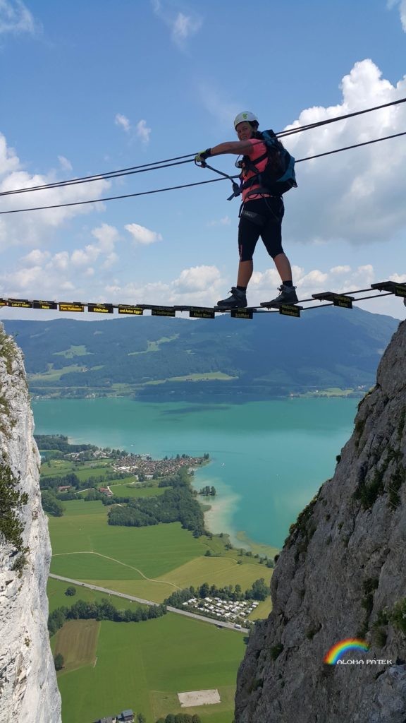 Ta vzdušná lávka je vlastně lehčí ze 2 cest na vrchol :-). Nástup na lávku ze stěny po skobach Radim nefotil. Pro mně zatím to nejšílenější co sem lezla, horolezec fakt nejsem.