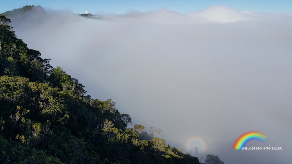 Vlivem teploty, větru a tlaku se oblačnost v údolí pohybovala jako by bylo údolí naplněno vodou. I když to tak z fotky nemusí vypadat, rozměry kráteru kolem celého údolí jsou úctyhodné. Útesy zde příkře padají do hloubky 800 metrů Vzduch byl prosycen nádhernou vůní hlíny a tropických květů. Za zmínku určitě ještě stojí nádherné parhelium či duhový odlesk v mracích, který se tvořil přesně v místech odkud jsem fotil. Tento trail, patří jednoznačně k nejkrásnějším zážitkům na ostrově Kauai.